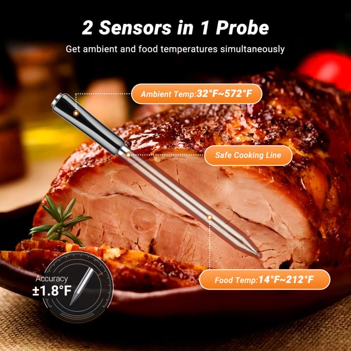 - Fast Respond & Accuracy Measurement:The design of 2 sensors in 1 probe allows the probe to get the internal food temperature and cooking environment temperature simultaneously with a high measurement accuracy of ±1.8℉, the internal temperature range is from 14~212℉, while the cooking environment temperature range is from 32~572℉,which makes the cooking process more perfect