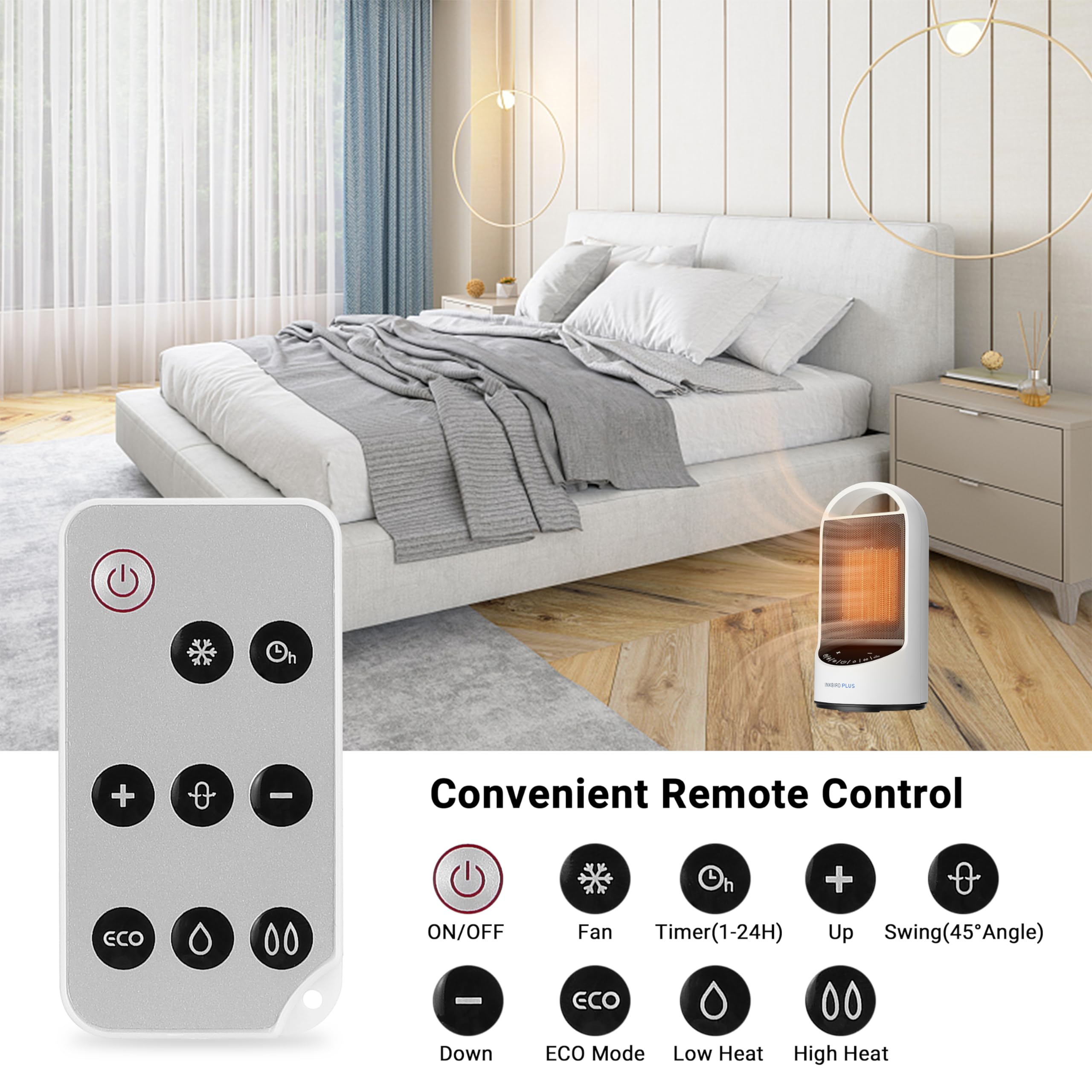 INKBIRDPLUS 1500W Electric Heaters for Indoor Use with Timer Remote and 3 Modes, Overheating &Tip-Over Protection for Office, Bedroom, Space Heater for Large Room